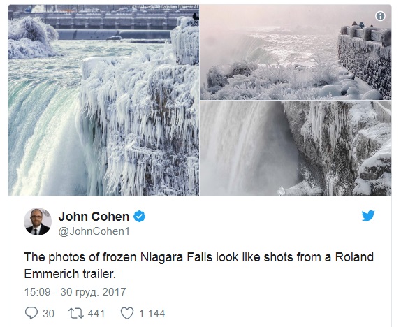 «Фото замерзлго Ніагарського водоспаду нагадують кадри з фільмів Роланда Еммеріха (режисера фільму «Післязавтра» – ред.), – написав у Twitter продюсер Джон Коен.